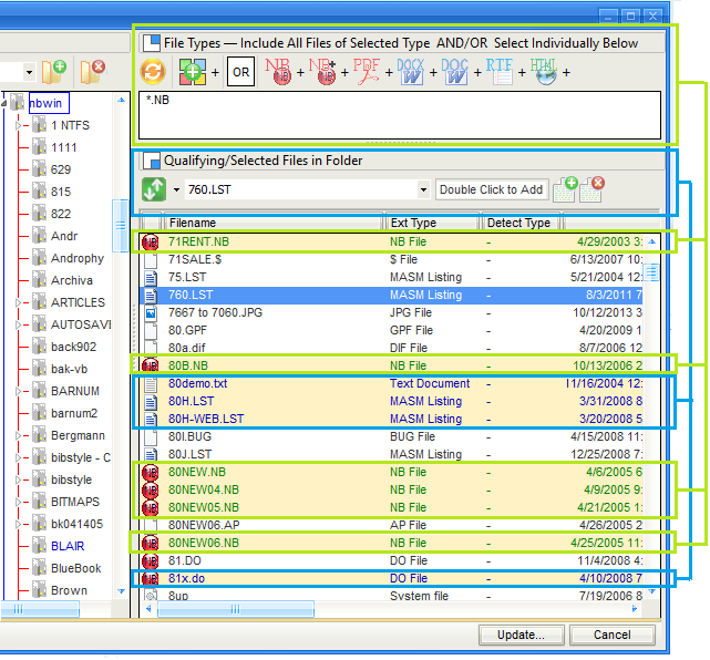 NOTE: All files in the current folder that match the selected type (that is, all files, except those excluded) will be automatically highlighted/selected (with a yellow/gold background) in the File Pane (the bottom right quadrant of this Add/Remove files dialog), with the filename in green: