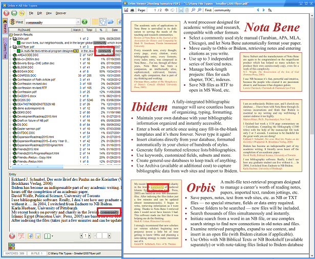 Orbis+, the new add-on module for Nota Bene, now lets you to search PDF, DOCX, DOC, RTF, and HTML files. The version of Orbis that has always been included in the Nota Bene Workstation — that lets you search NB or TXT files — is still included in Nota Bene. But now, with Orbis+, you can expand the range of searchable files to include PDF, DOCX, DOC, RTF, and HTML files. Now, more than ever — whether running on Windows, or on the Mac+Wine — the new Orbis+ is the “Idea Discovery Tool” that can qualitatively change the way you work.